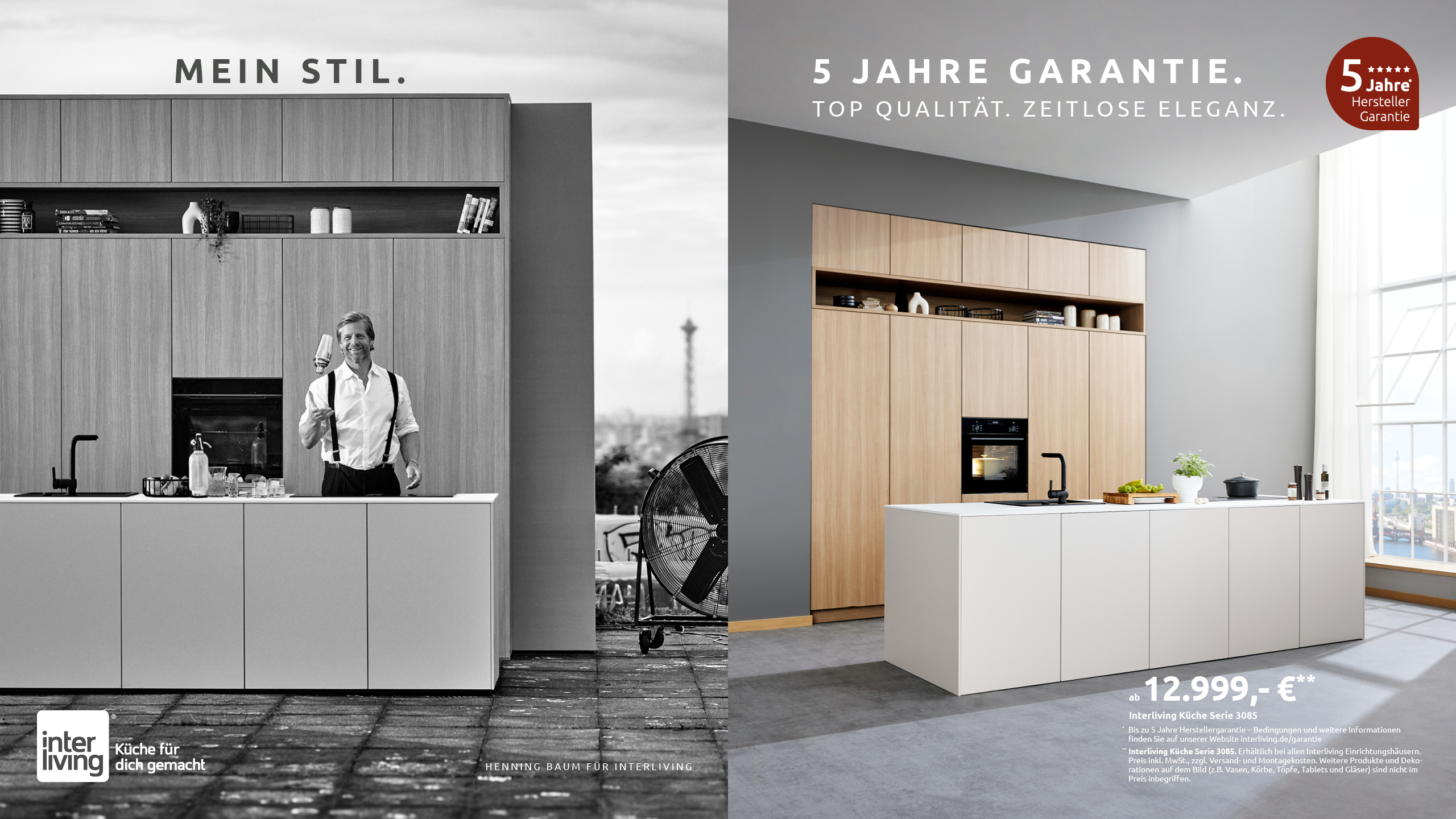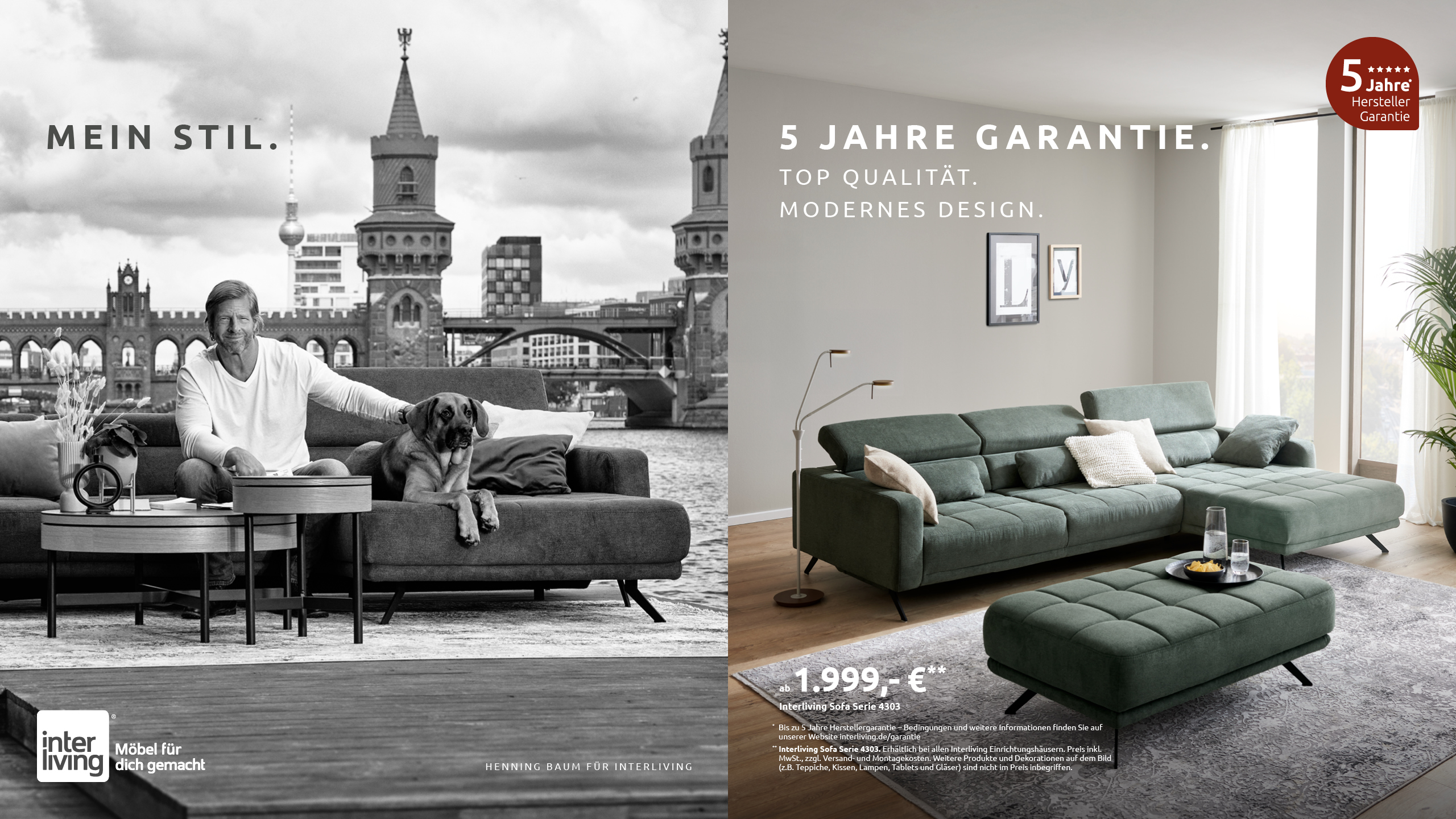 Bereits im vergangenen Jahr erzielte Baum als Markenbotschafter große Resonanz. Nun wird die erfolgreiche Zusammenarbeit mit neuen Motiven und Formaten fortgesetzt. Inhaltlich knüpft Interliving bewusst an das Konzept des Vorjahres an: „Mein Stil“. Die Kulissen stehen sinnbildlich für die Verbindung von Natur und Urbanität – ganz im Sinne von Henning Baum. Der Schauspieler, im Ruhrgebiet aufgewachsen, findet seinen Ausgleich beim Angeln und in der Natur. Die Kombination aus ausdrucksstarken Kulissen, hochwertigem Möbeldesign und einer glaubwürdigen Persönlichkeit macht die neuen Motive besonders wirkungsvoll – Möbel und Markenbotschafter treten gleichermaßen in Erscheinung.